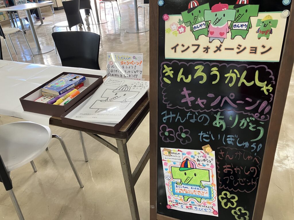 11月23日(日)は勤労感謝の日です✨きんそうセンターでは11月16日(日)~12月14日(日)まで勤労感謝ウィークとさせて頂き、お子様対象のイベントを開催します!!働くお父さん、お母さん、感謝を伝えたいあの人へ、ありがとうの気持を伝えませんか?きんぞう君の塗り絵にメッセージを書いて頂き、ロビーに掲示させて頂きます。
