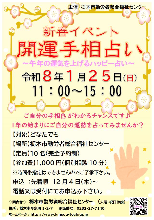 R8年1月25日(日)新春イベント🌸「開運手相占い~午年の運気を上げるハッピー占い」開催決定&参加者募集! 毎年大好評★新春イベントの手相占いを開催致します!あなたの午年の運気はいかに?!ご自分の手相がわかるチャンスです✨お見逃しなく! お申込みは12月4日(木)~です! 投稿日:2025年12月1日 カテゴリー:お知らせ