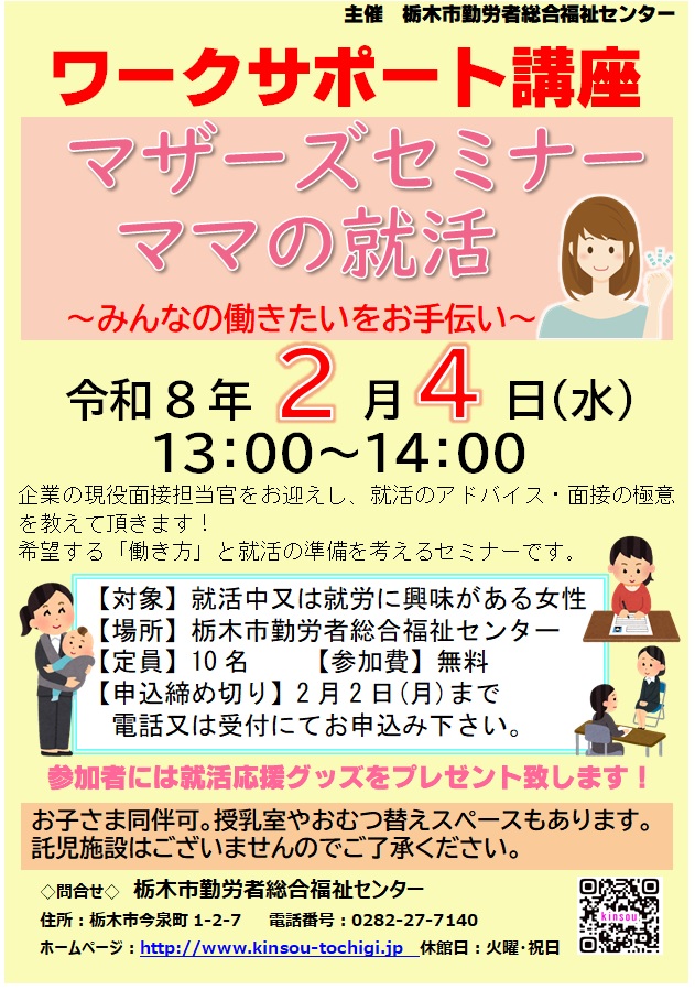 R8年2月4日(水)ワークサポート講座「マザーズセミナーママの就活~みんなの働きたいをお手伝い」を開催&参加者募集!