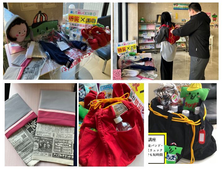 2011年3月11日東日本大震災から15年が経過致しました。防災について考え、防災意識を高めて頂きたく、施設1階ロビーへ防災&エココーナーを設置致しました。勤総センターでは楽(らく)して楽(たの)しく防災&エコをテーマに講座を開催しております。今まで作った防災品、リュック、スリッパ等を展示しております。またきんぞうチャンネルにて防災やECOに関する動画を発信しております。是非お楽しみいただければ嬉しいです(^^♪